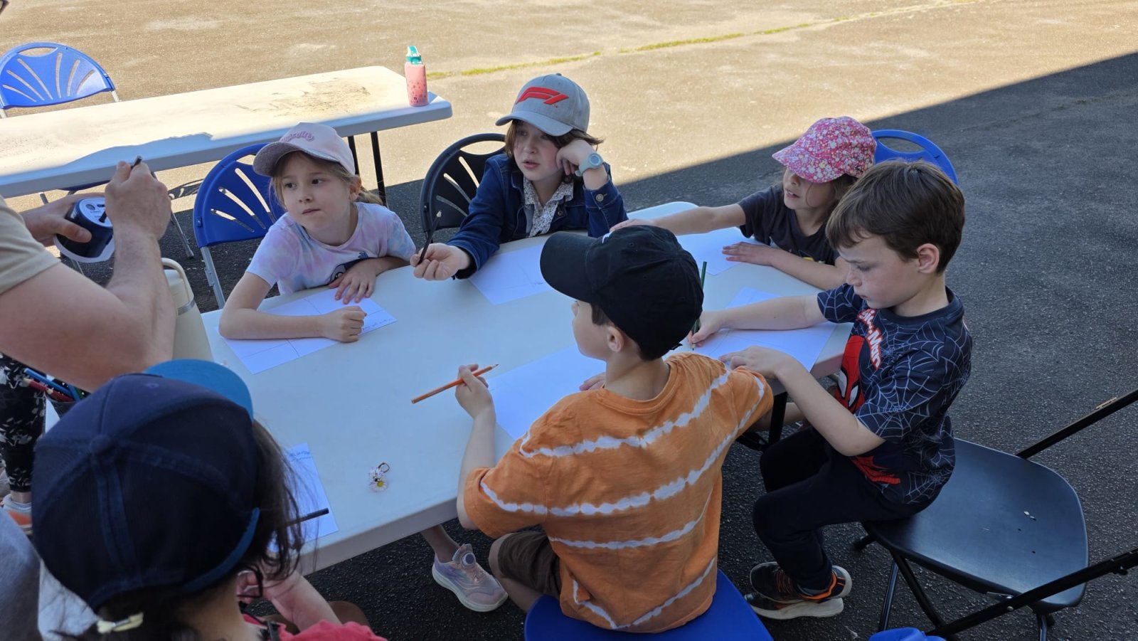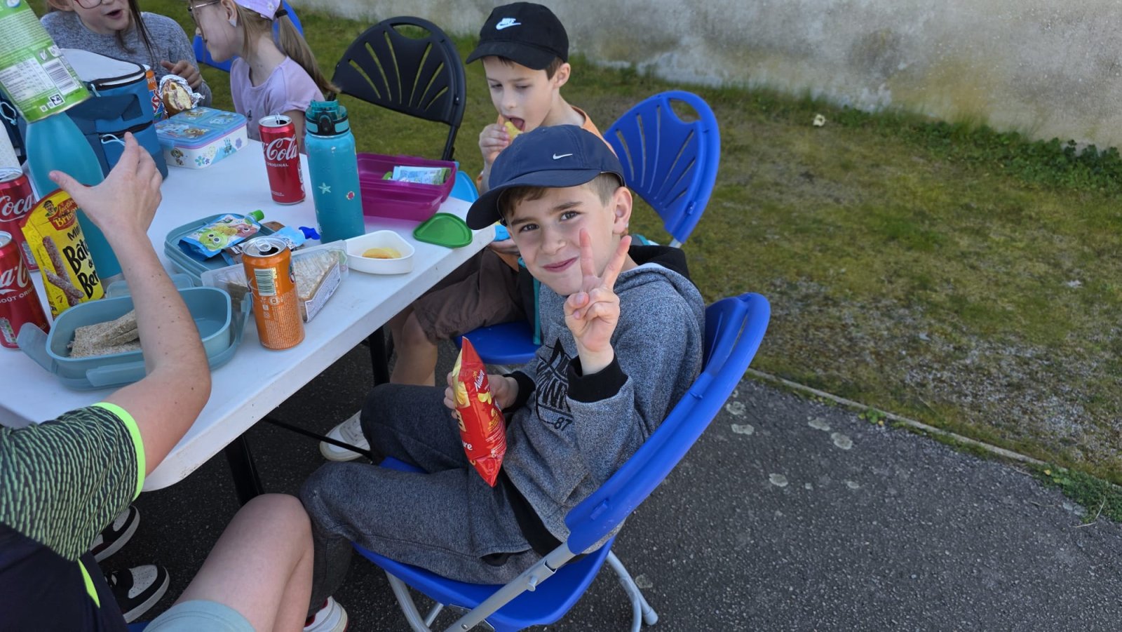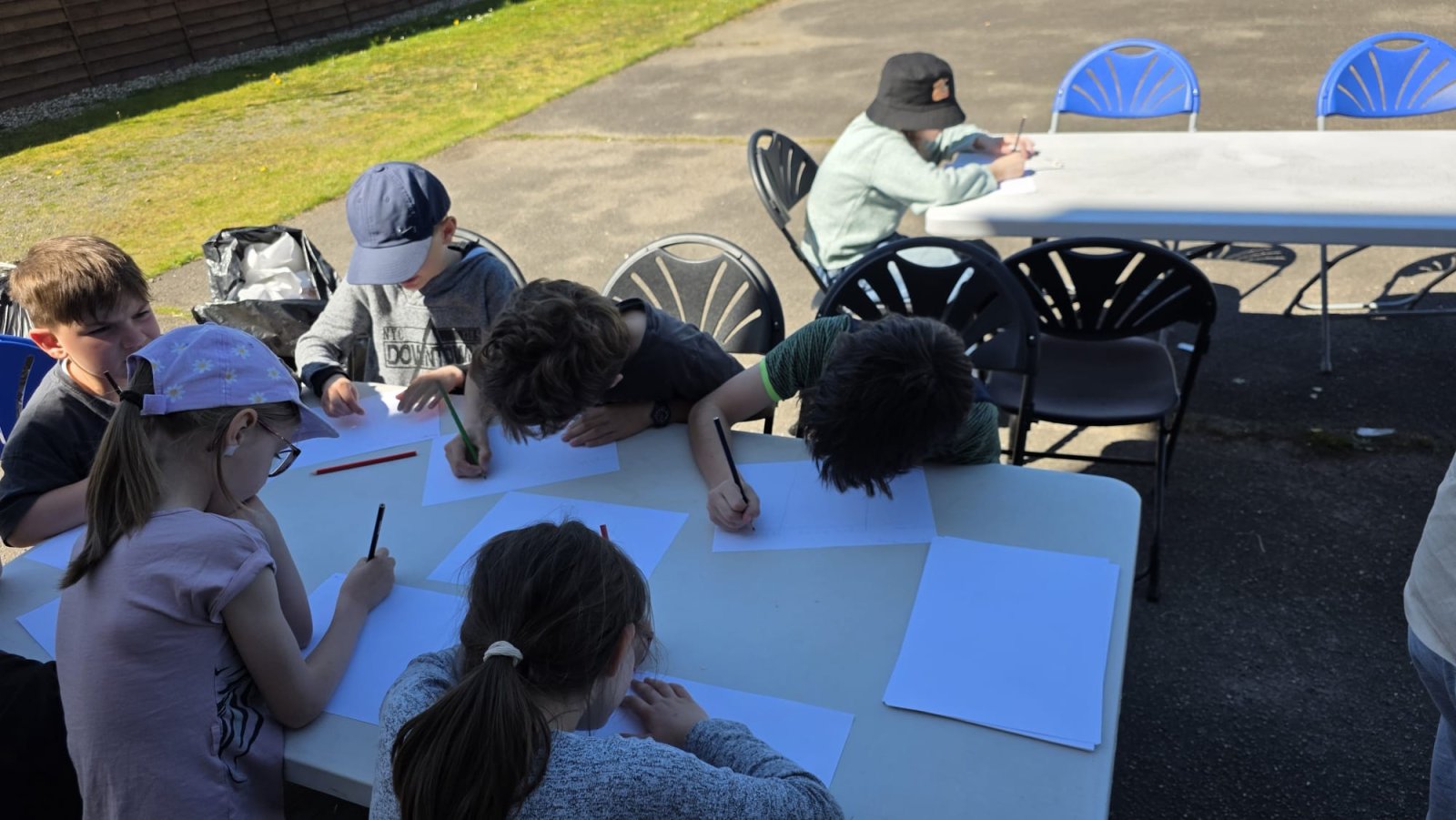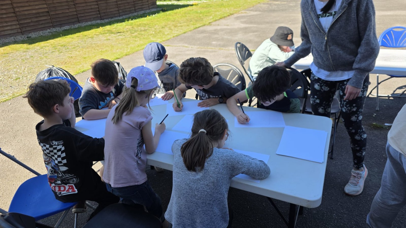Le midi, le soleil était au rendez-vous ! Nous nous sommes installés dehors pour partager un pique-nique convivial. Ce moment de détente a été suivi d'un temps calme original : un exercice d'écriture.